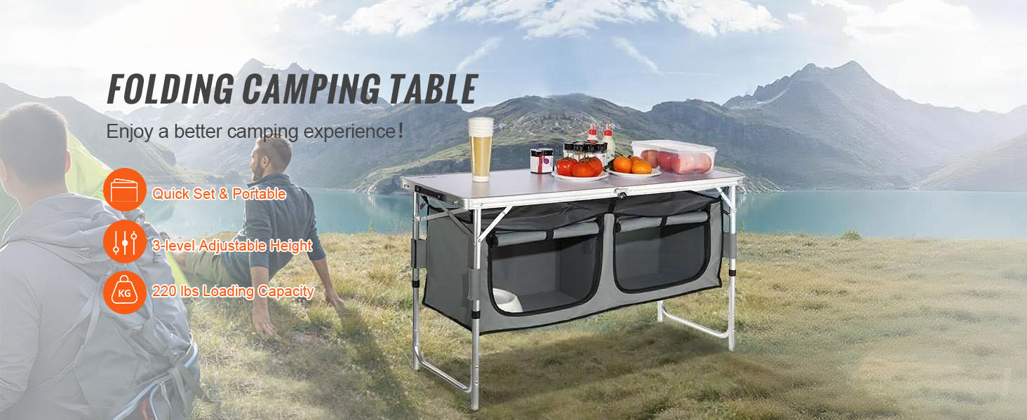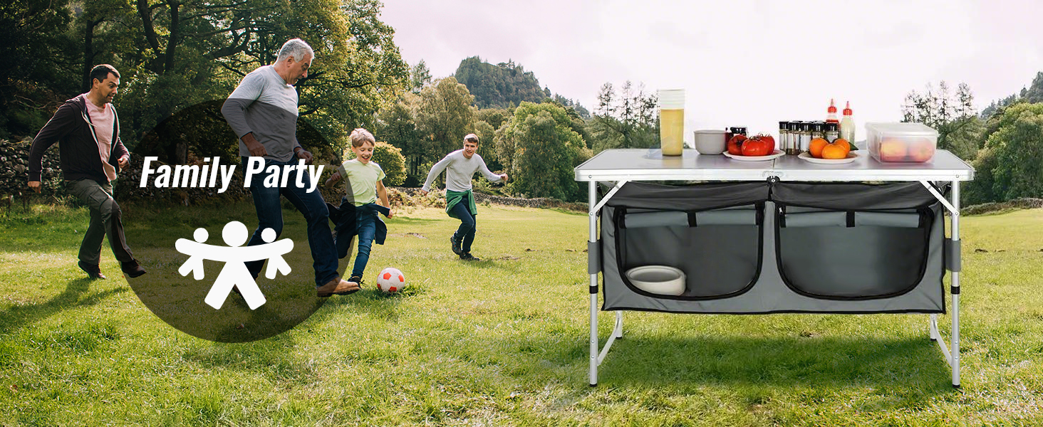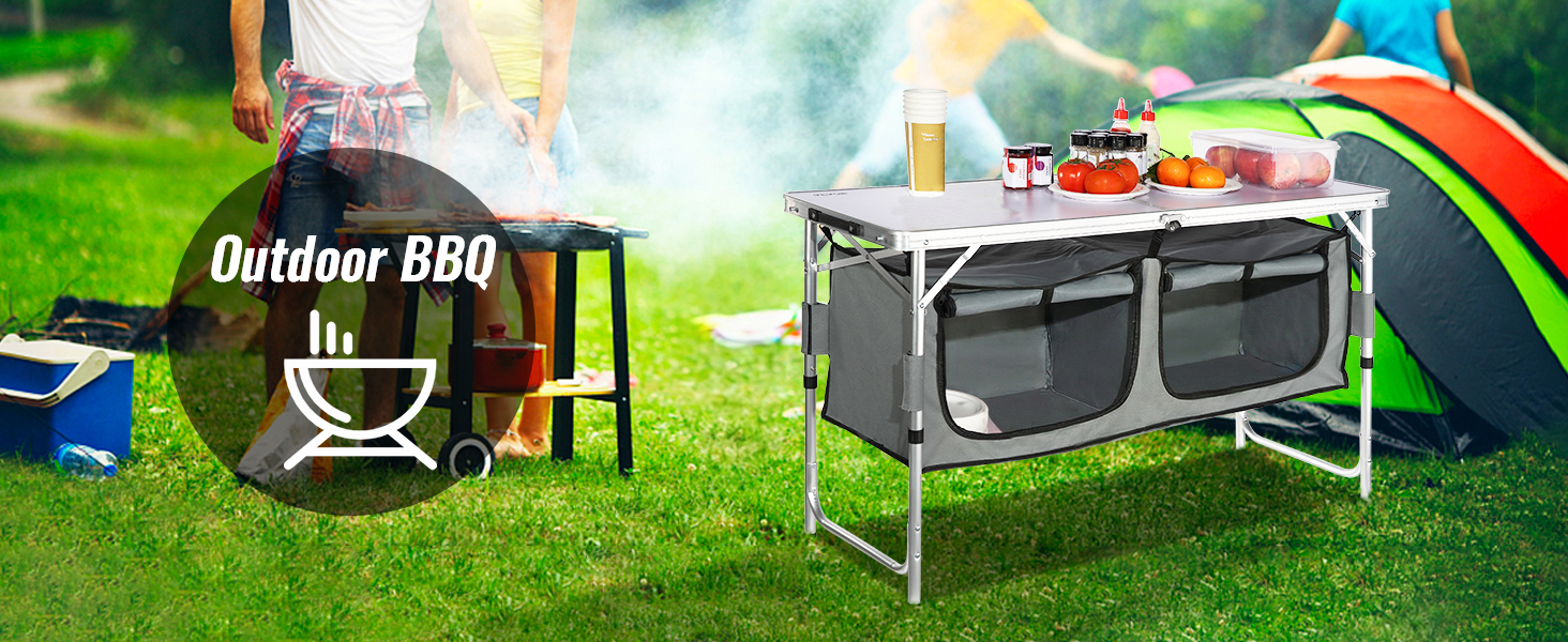 Great Space Management: Our camping kitchen table is designed to take your kitchen outside! You can organize your food, stoves, grills, and cookware in an orderly manner on the tabletop, and zippered storage compartments.
